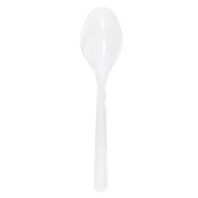 Cuchara desechable fabricada en plástico PS transparente. Reciclable y reutilizable.