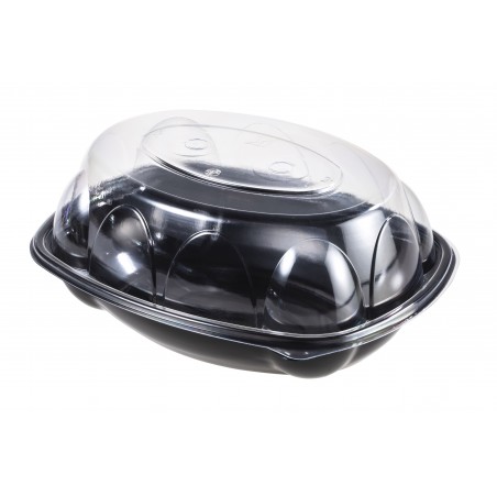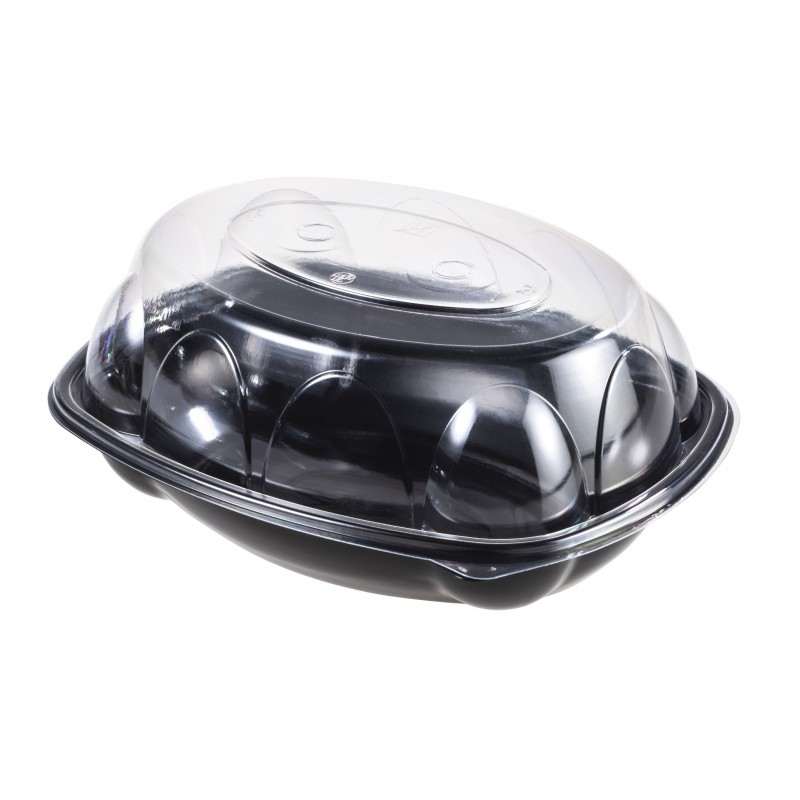 - Embalagem para frangos assados. - Adequado para uso em micro-ondas. - Tampa incluída no preço. - A tapa é feita de plástico OPS, não é adequada para micro-ondas. - O preço indicado é para 135 unidades.