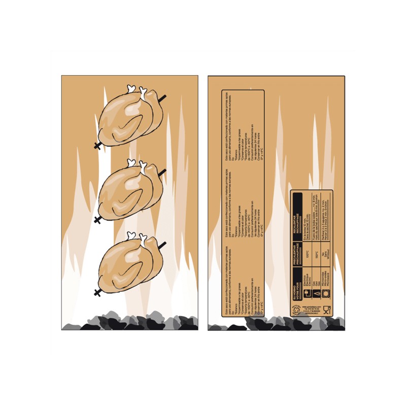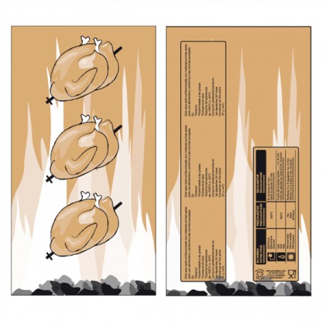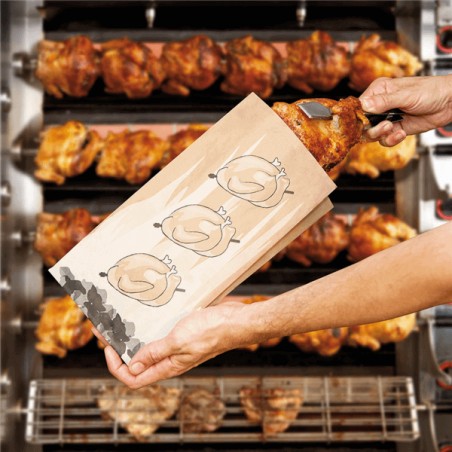 - Perfeita para transportar frango assado. - Gramagem: 45 G/M2 + 15µ PP - Temperatura: -40ºC/+100ºC. - Adequado para micro-ondas e forno. - Resiste óleo e gordura. - O preço indicado é para 100 unidades.